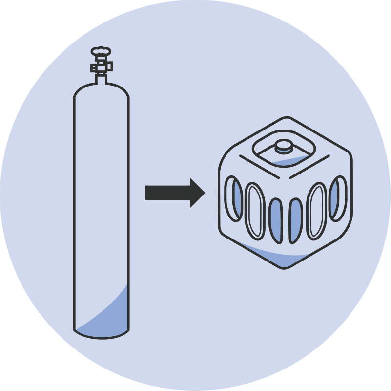 多孔性配位高分子のガスをコンパクトに貯蔵できる機能を用いて、高圧ガス容器を「コンパクト・軽量・スマート」に再発明した次世代高圧ガス容器CubiTanⓇの開発を行っています。窒素や酸素、アルゴンといった一般的な産業用ガスのみならず、バイオマス由来のメタン、余剰再生可能エネルギー由来の水素をターゲットとし、CubiTanⓇをガスデリバリーのビークルとして活用することで、分散独立型のエネルギーシェアリングの構築を目指します。