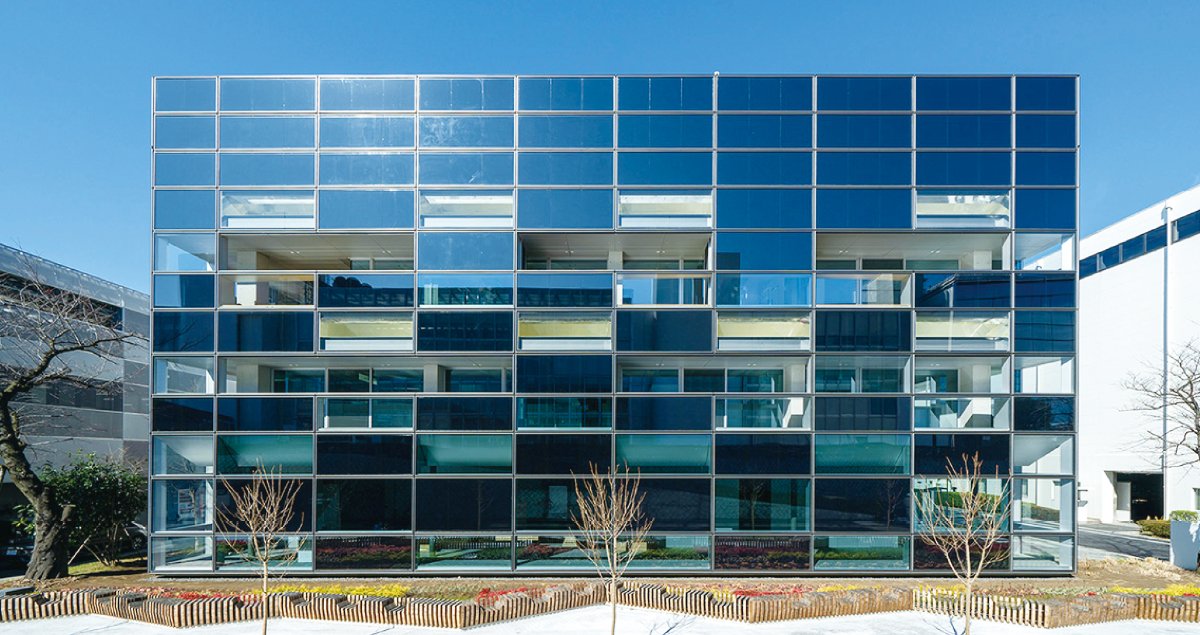 大成建設技術センター人と空間のラボ(ZEB実証棟)。太陽光パネルが極力目立たないハイレベルの施工を実施。