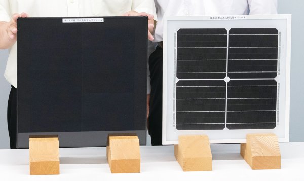 右は従来型のモジュール。左の新しく開発した太陽光発電モジュールは、電極を裏面に集約することで建物の外観イメージを損なわない形状が可能になった。