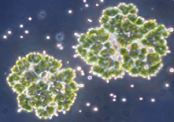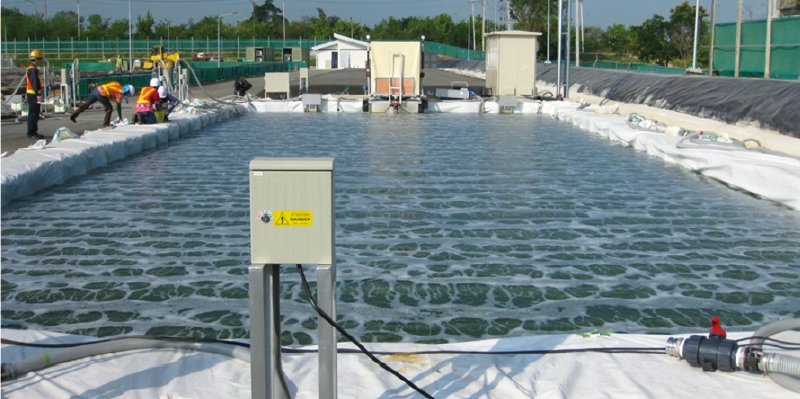 タイ・サラブリ県にて微細藻類の大規模培養池を設置し、パイロットスケール屋外培養試験を実施(右:藻体ボツリオコッカス)。(下:藻体ボツリオコッカス)。