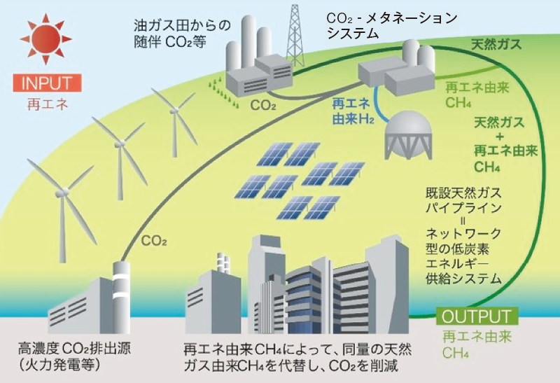 政府は、2050年までに温室効果ガスの排出を全体としてゼロにするとしており、火力発電から発生するCO2や天然ガスの随伴CO2を、再生可能エネルギーの電力でメタンに変換して利用するメタネーションは、重要な役割を担っています。