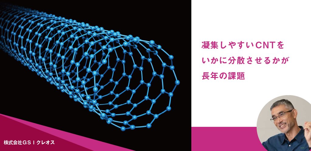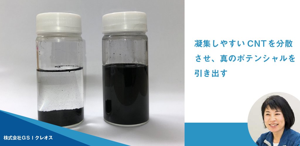 CNTをいかに分散させるか。しかも、極力その長さも保たなければいけません。GSIクレオスはこの課題を解決する技術の開発に取り組み始めました。