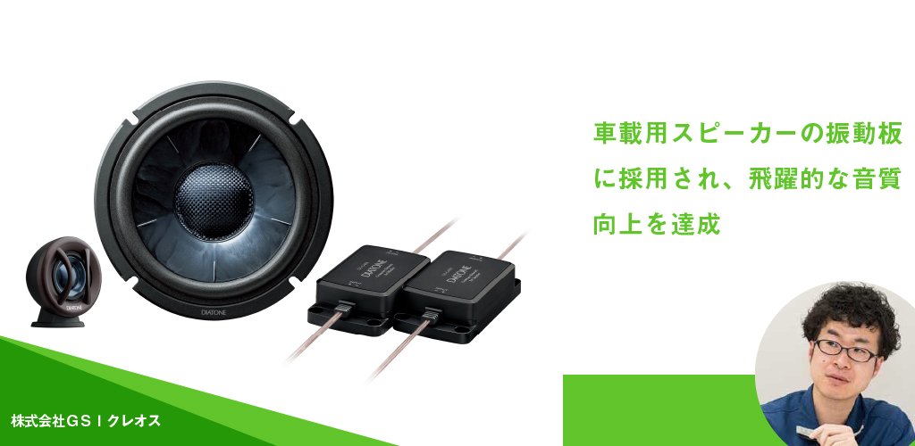 母材の種類や材料、粘度などの要望は顧客によって異なるため、用途ごとに適切な条件を検討する必要があります。NEDOプロジェクト終了後の現在も、量産化に向けて継続的な研究開発、改良開発に取り組んでいます。このような試行錯誤を重ねてきた中でも、自分たちが取り組んできたことが正しかったと自信になったのが、三菱電機株式会社の車載用スピーカーへの採用事例だと柳澤さんは言います(写真8)。