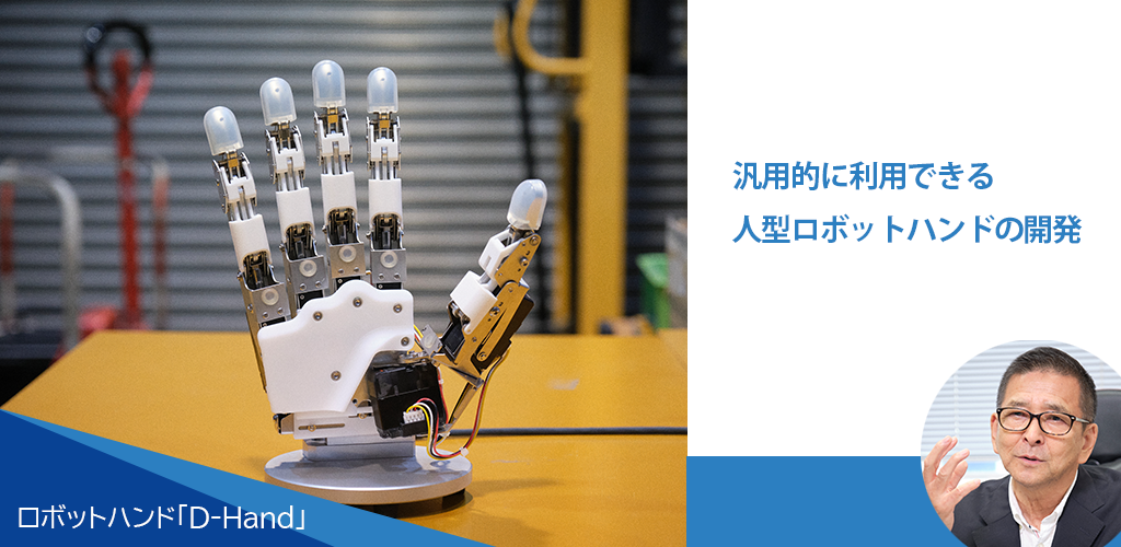 ダブル技研株式会社(以下、ダブル技研)の開発したD-Handは、からくり機構を応用した独自のメカニズムで、1個のモーターでもすべての指を連動させて制御することができ、多様な物を把持できる多指・多関節型のロボットハンドです。その開発史は、FA機器開発と福祉機器を手掛ける同社と、東京農工大学(以下、農工大)博士課程の学生が考案した義手モデルとの出会いから始まりました。
