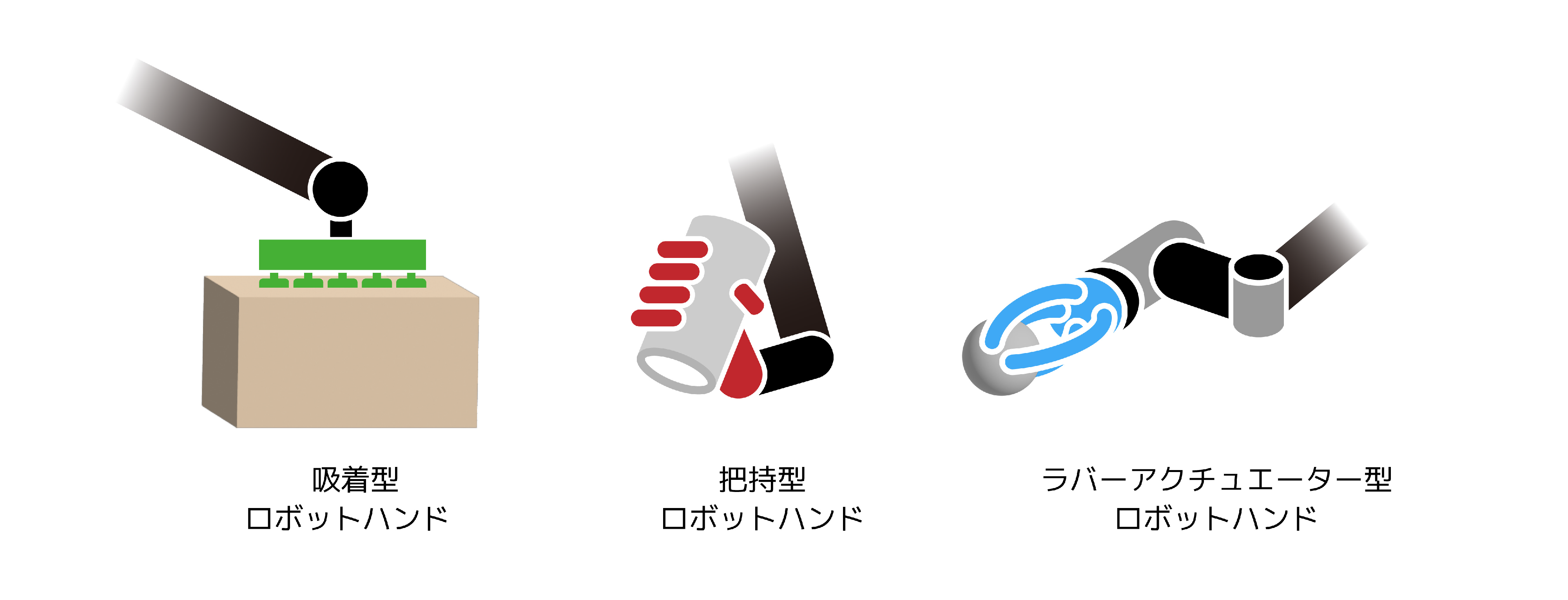 産業用ロボットハンドは、主に把持型、吸着型、ラバーアクチュエーター型のなどの分類があります。把持型は指を開閉させて物体を把持し、吸着型は真空や磁力を利用して物体を吸着します。これらの機能により、ロボットハンドは製造業や物流業などで物体の移動や配置に活用されています。