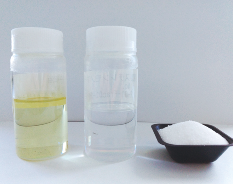 分解オイル(写真左)と回収スチレンモノマー(中央)と再生ポリスチレン(右)。